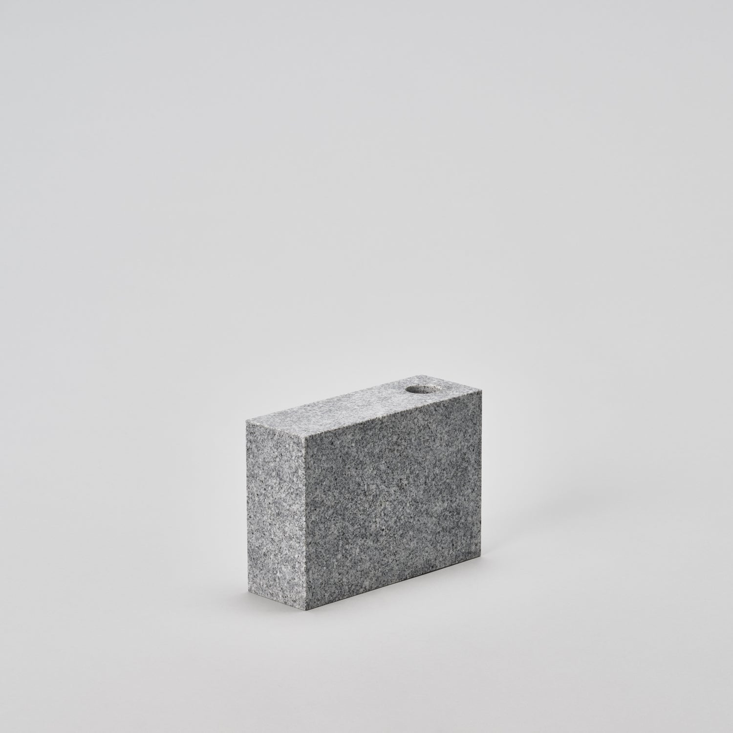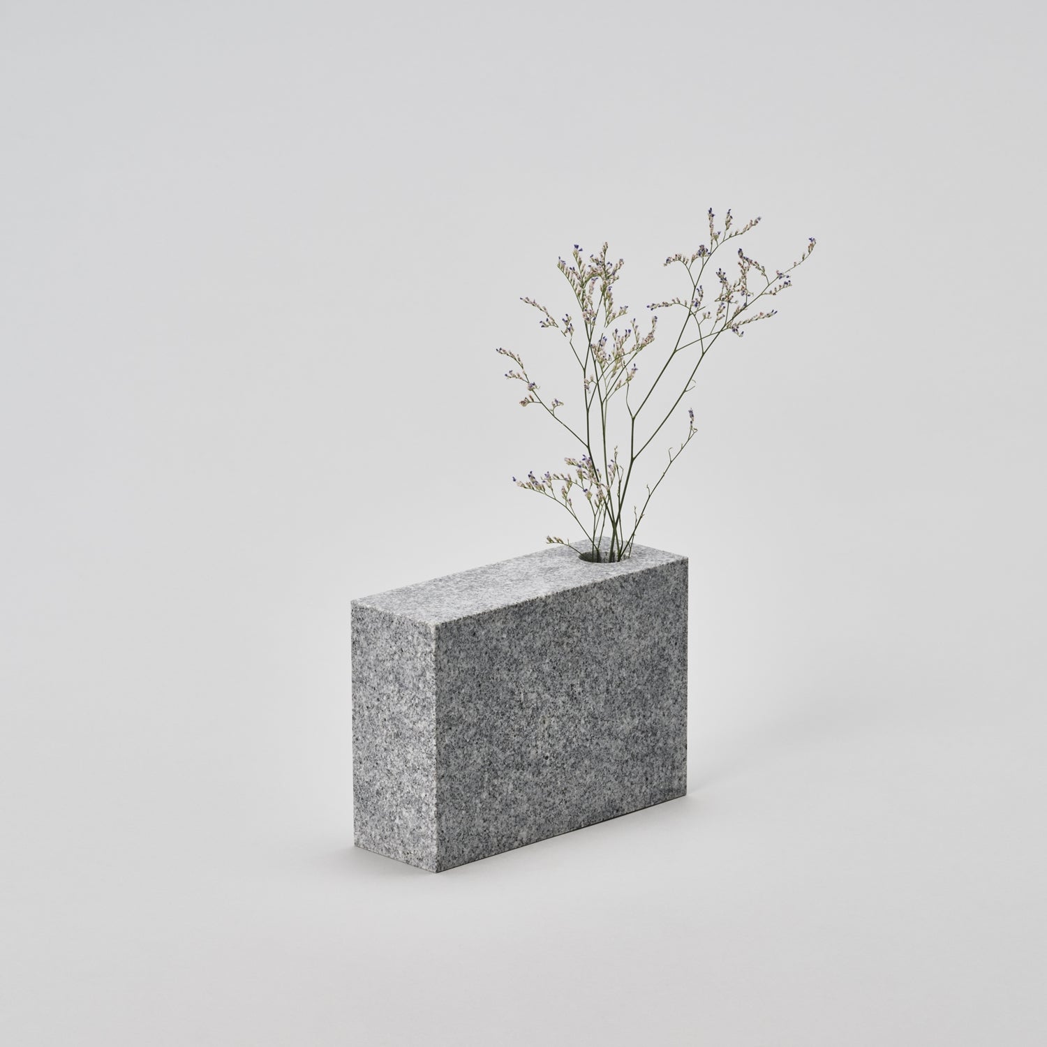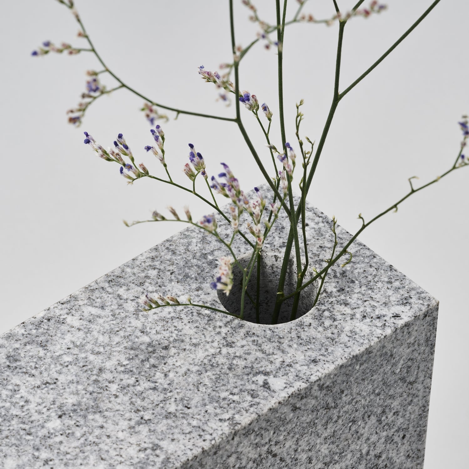 四角い石の塊のようなフラワーベースです。質量があるので、高さやボリュームのある植物でも安定してお使いいただけます。