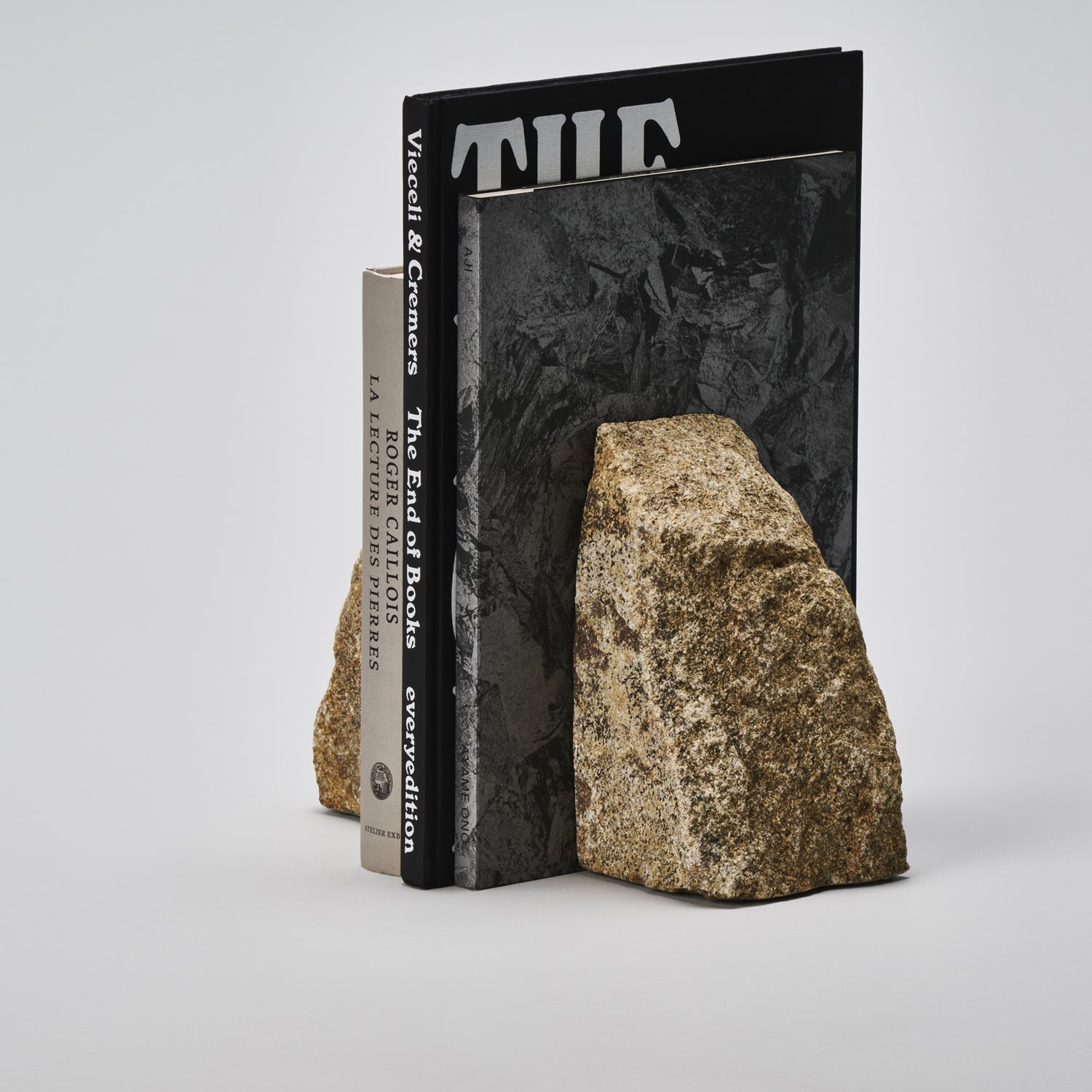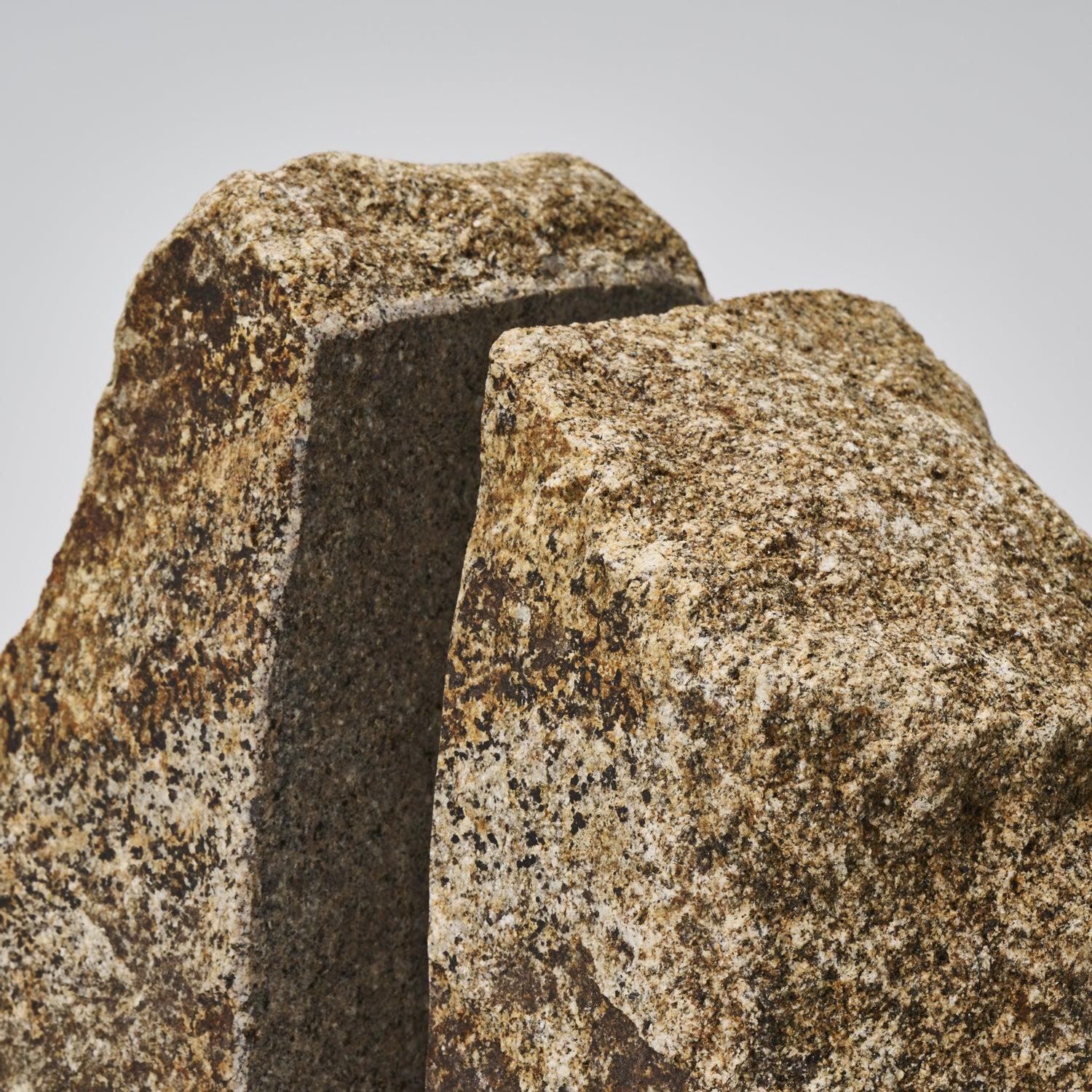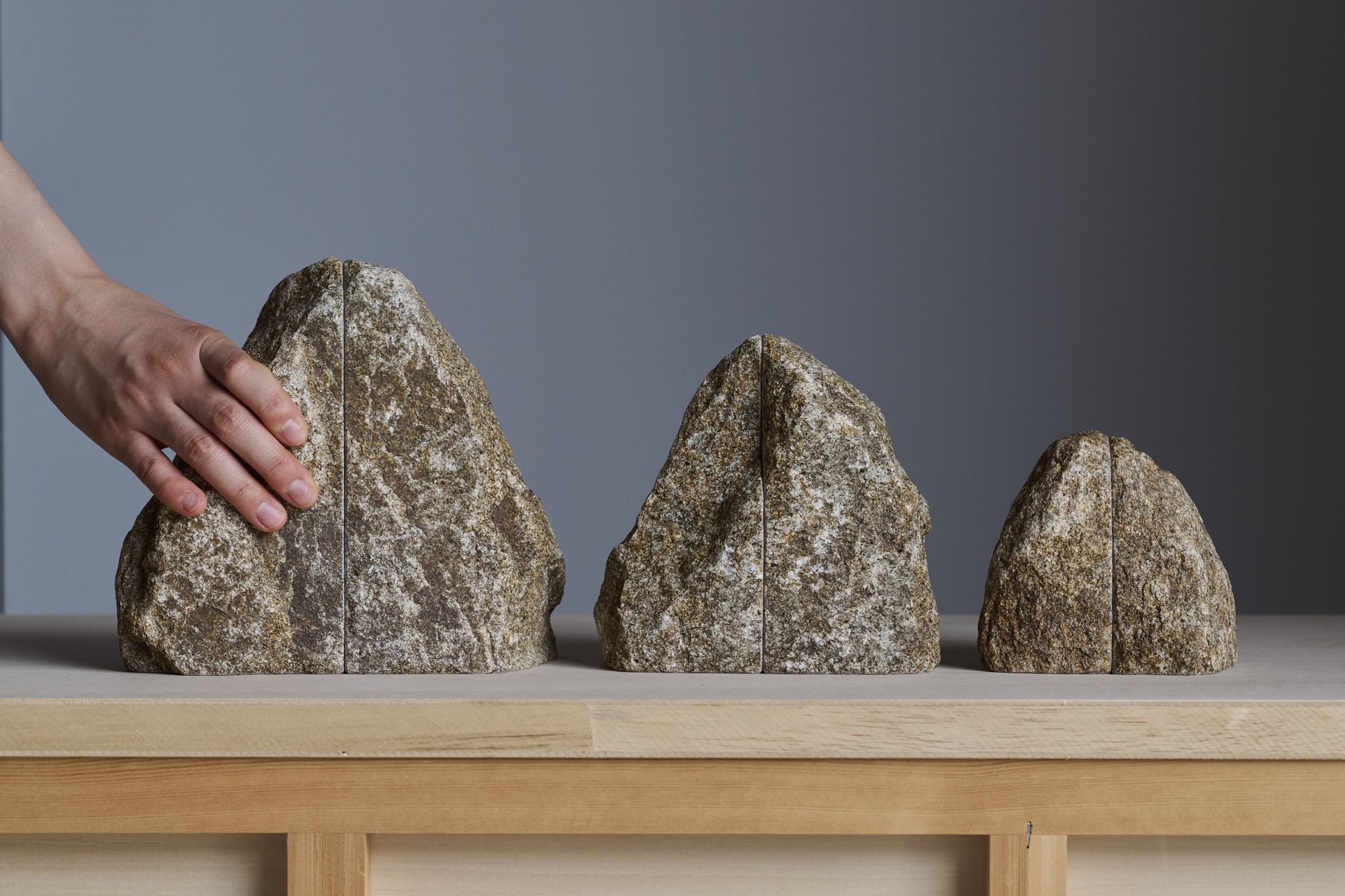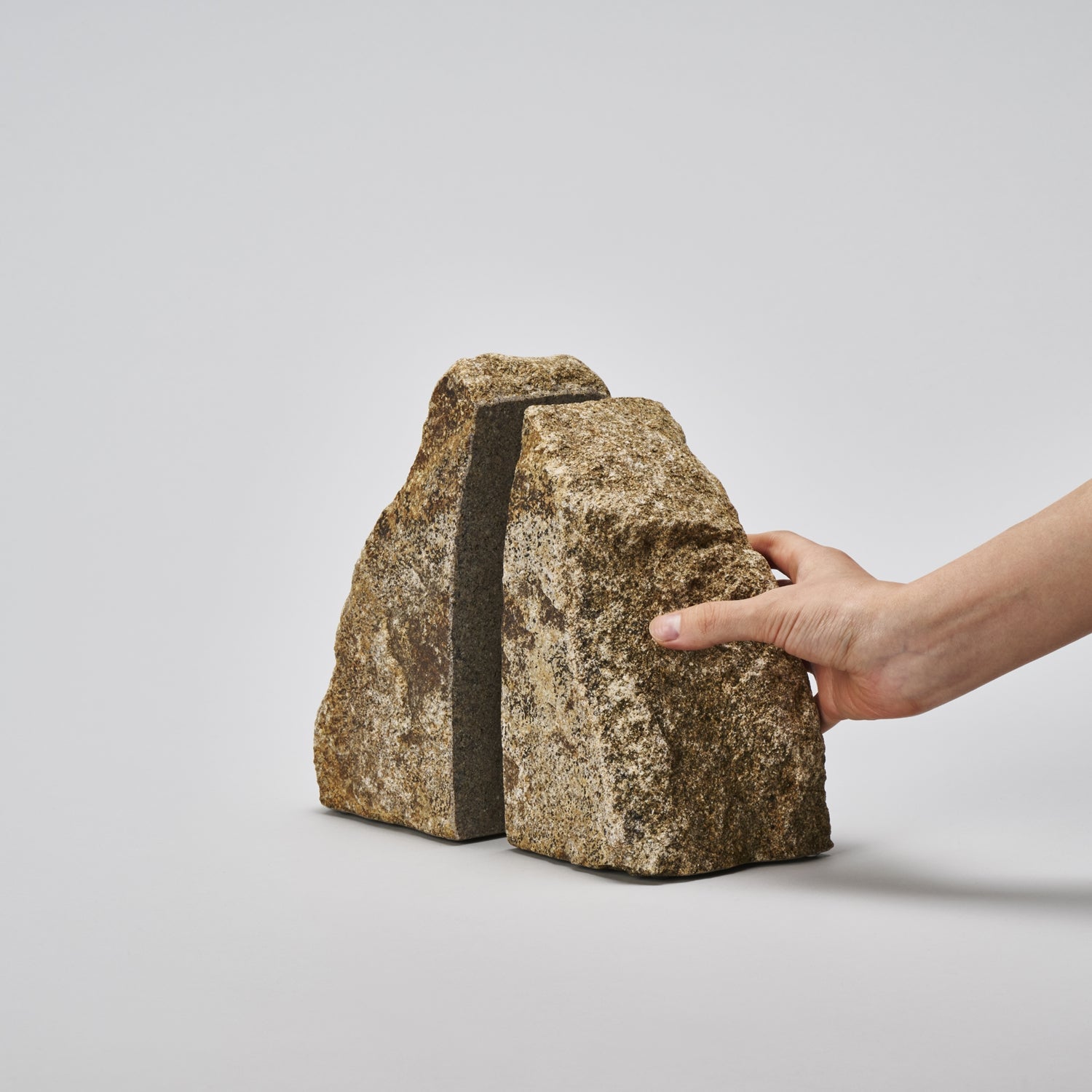 石の自然な形を活かしたブックエンドです。1つの石を2つに割り、本に接する面と底面は本や設置面を傷めないように研きの加工を施しています。自然石の独特の存在感が生活のアクセントになります。