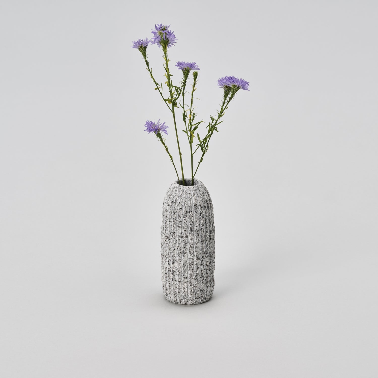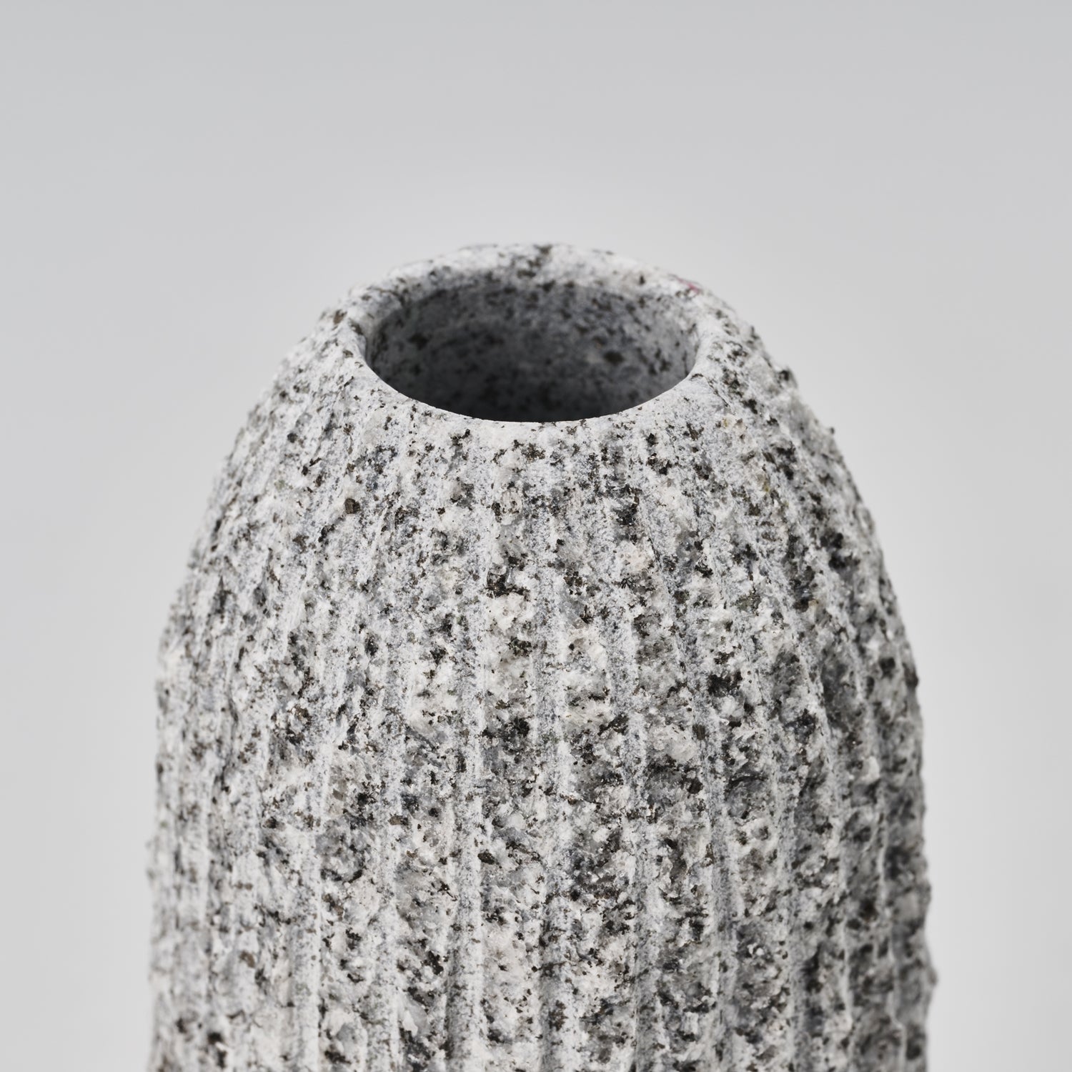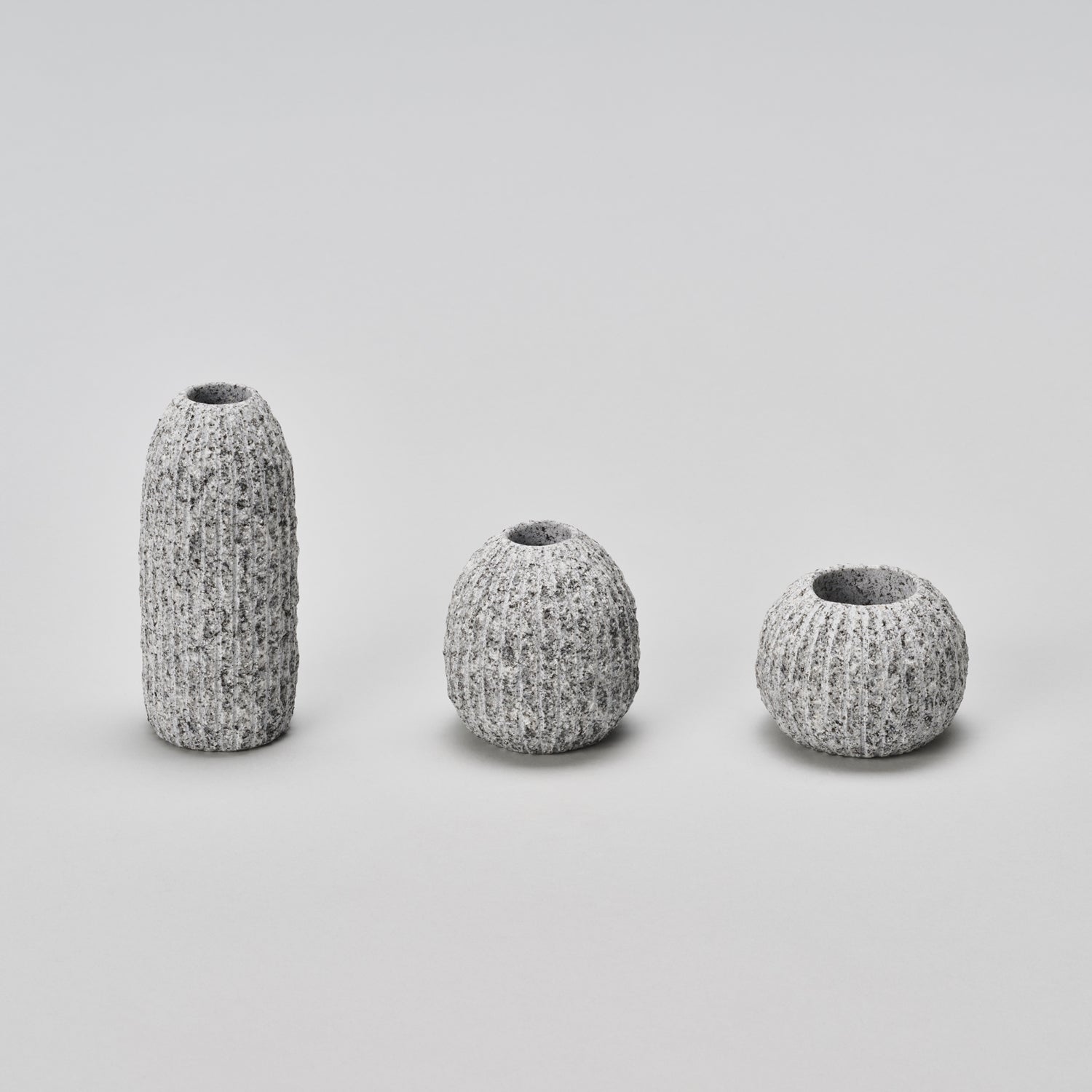 A series of vases resembling cacti due to the vertical carvings. The different sizes in conjunction with the rough vertical lines create a charming space that can surely soften the atmosphere of any room.