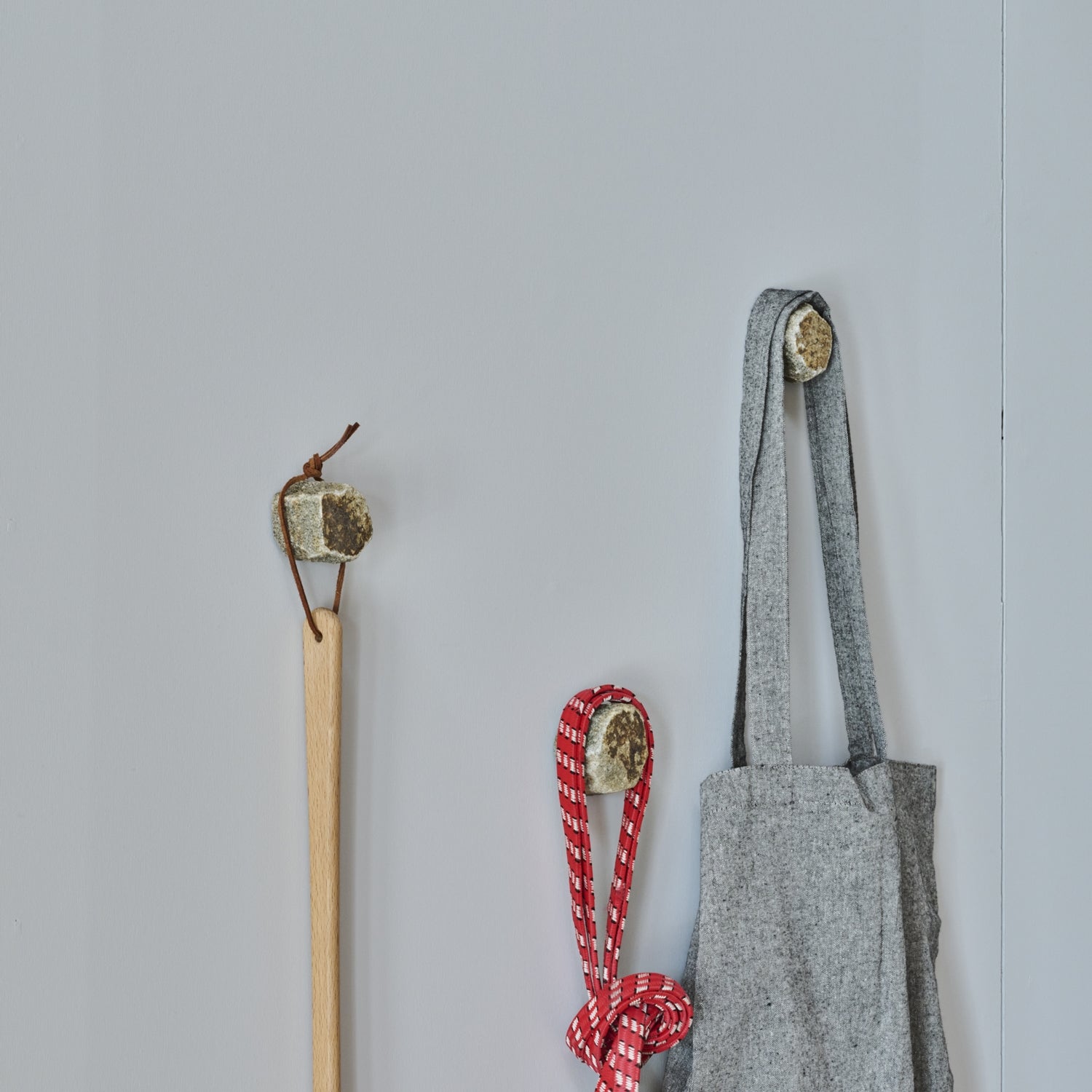 A “hook” crafted from natural stone. When positioned on the wall, it is meant to resemble stone emerging from a mountain face. Alternatively, it can be used as decorations when not used as a hook to help create an earthy atmosphere in any room.